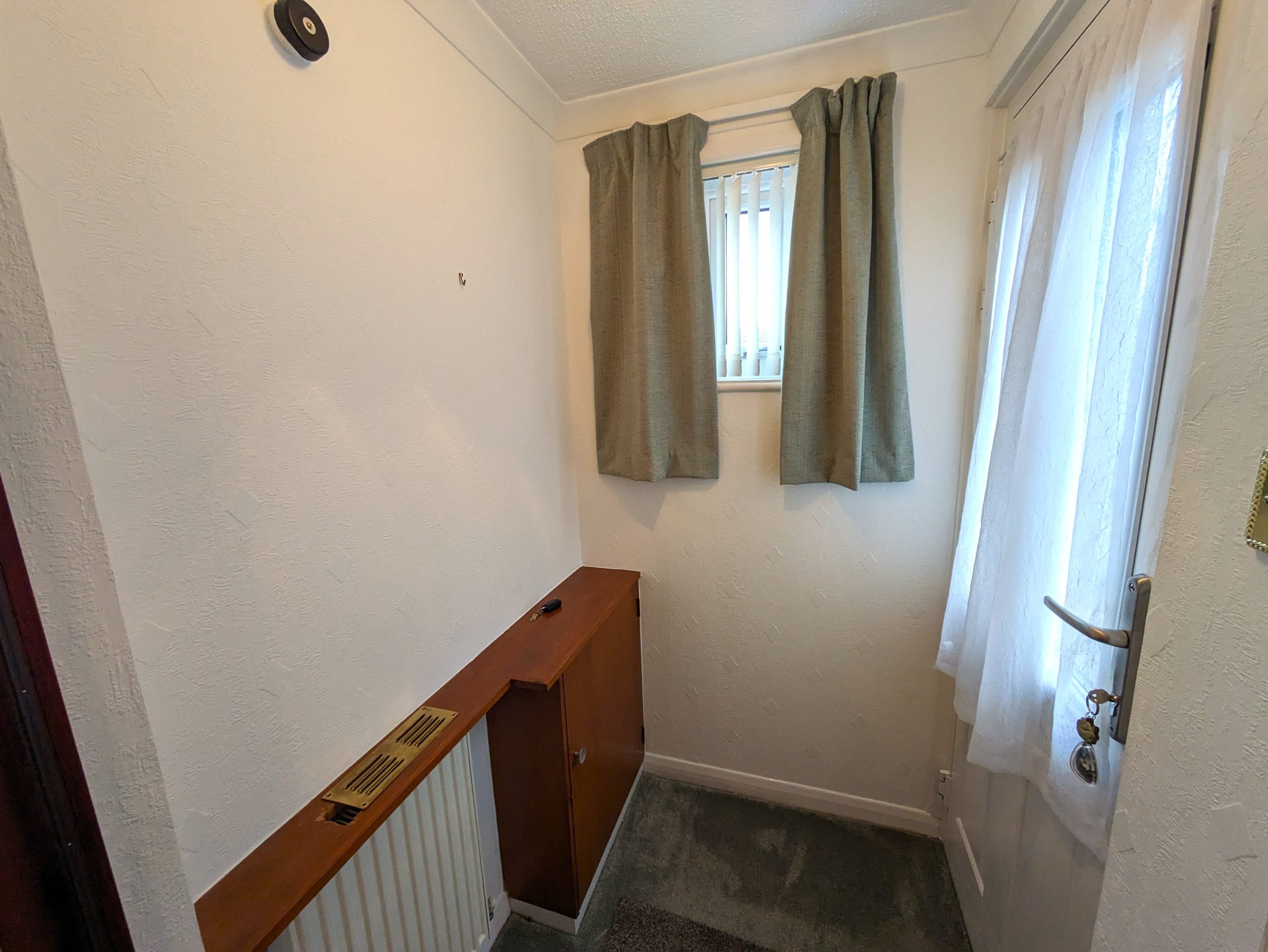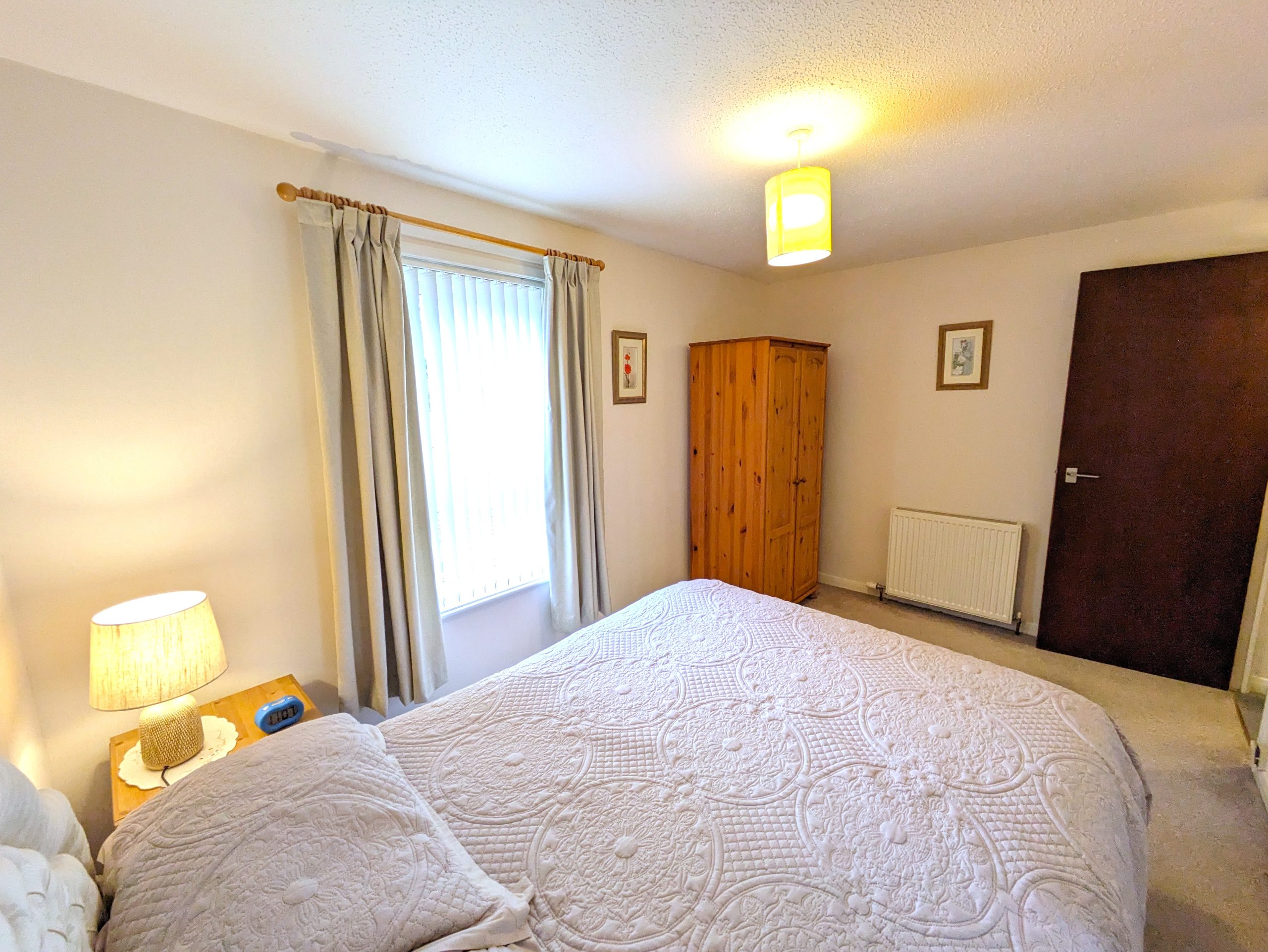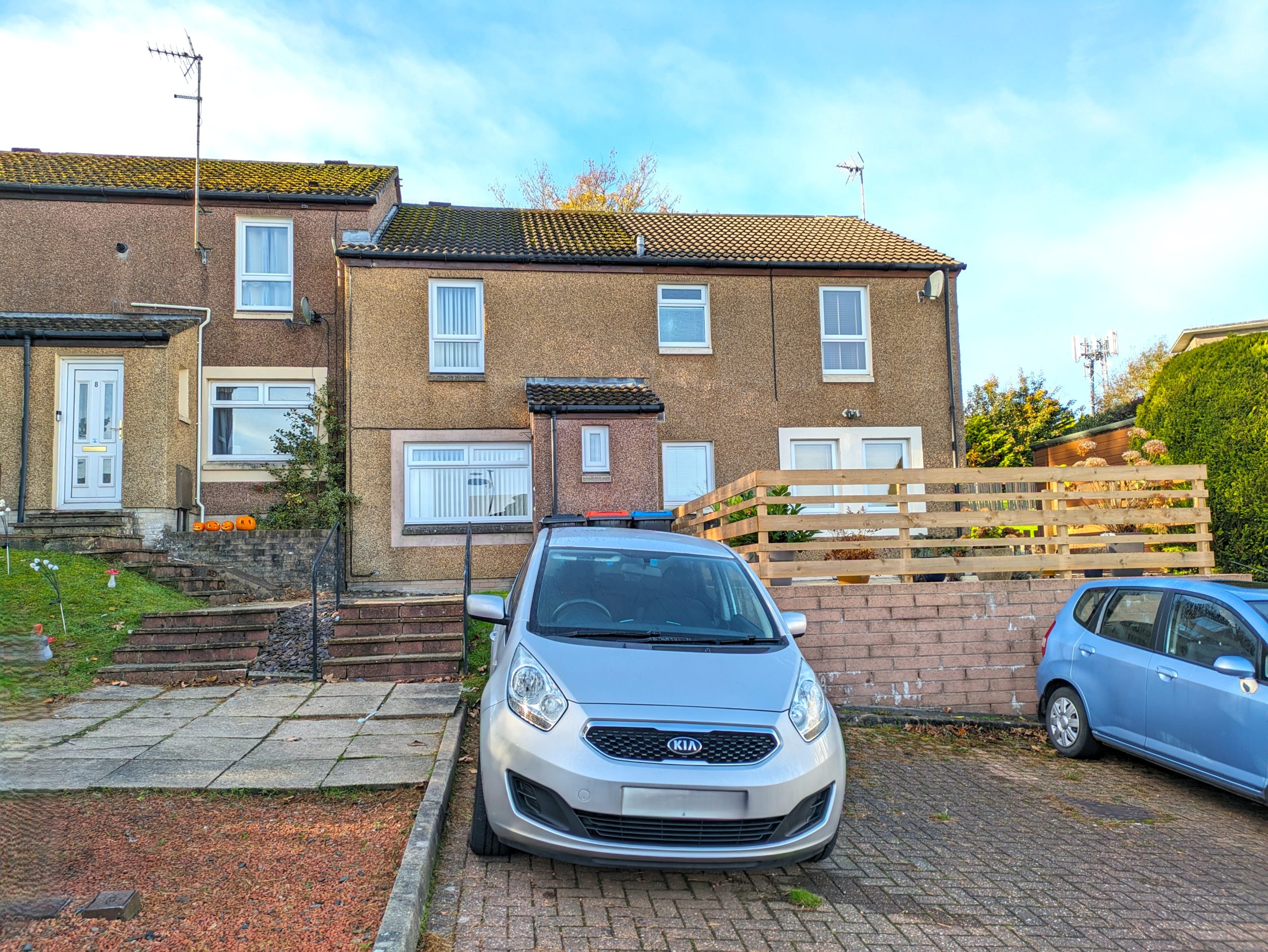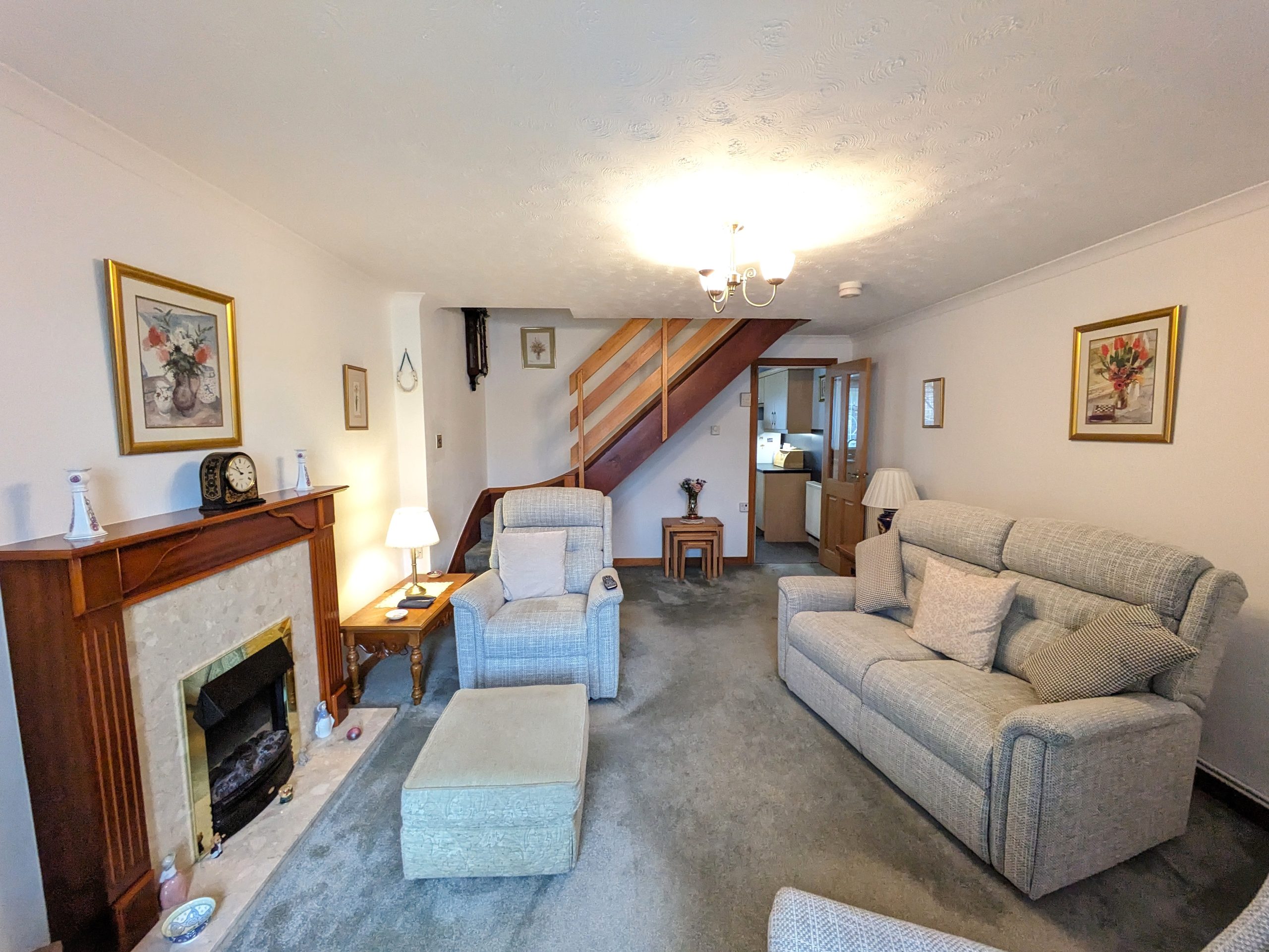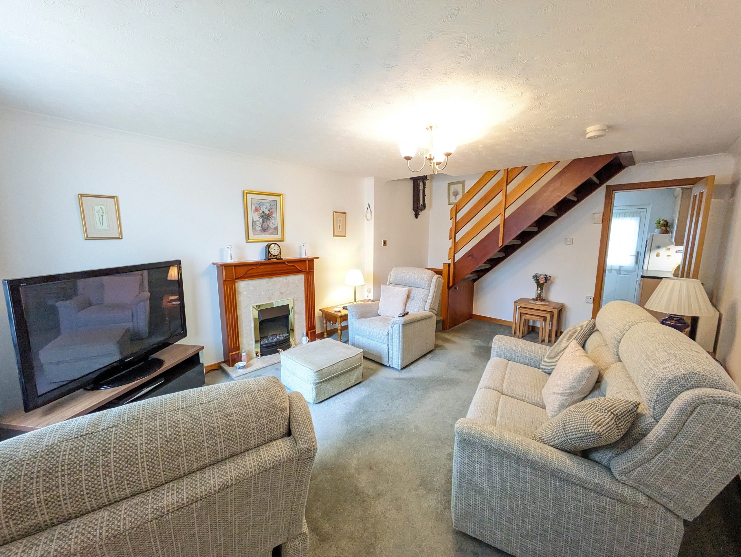 ACCOMMODATION COMPRISES: From the front of the house, steps lead up to front door. Entering the property into the vestibule via a UPVC door with half frosted glass panelling. The entrance vestibule has a small window to front, ceiling light, cupboard housing the electric meter, carpeted flooring which carries on through to the lounge with wooden door featuring glass panelling. The lounge itself is carpeted with large window to front, ceiling light, two radiators and a wooden door with glass panelling leading off into kitchen. The lounge incorporates open riser staircase to upper landing with small understairs storage cupboard and features decorative fireplace with wooden mantle and surround marble effect hearth and electric fire. The kitchen is ample and is fitted with carpeted flooring, a selection of wooden effect wall cupboards, one of which houses the ‘Ideal’ combi boiler, base units and marble effect laminate worktops which incorporates working areas and extends to a fixed wall mounted table. Single drainer sink unit with window to rear overlooking garden, integrated ‘Blomberg’ electric cooker with gas hob with extractor hood, ‘Indesit’ tumble dryer condenser, standalone ‘Beko’ fridge freezer and washing machine which are all included in sale. Wooden effect UPVC door with half glass panel leads from kitchen to back garden. Carpeted stairs with wooden banister leads to upper landing, which is carpeted with ceiling light, hatchway to loft, linen cupboard and leads off to both bedrooms and shower room. Both bedrooms are double in size, carpeted with ceiling lights, radiator and built in mirrored wardrobes. One front facing, one rear. The fitted bathroom comprises of WC, wash hand basin, shower cubicle with mains shower and folding glass doors. Full Respatex surround, tile effect vinyl flooring and ceiling light. The outside of the property has a private garden to the rear, made up of patio/area of slabs. Split level with steps giving access to top tier which has wooden shed. Brick built wall and wooden fence to border. To the front there is a slabbed area with steps leading down to allocated parking bay and a shared area of lawn.