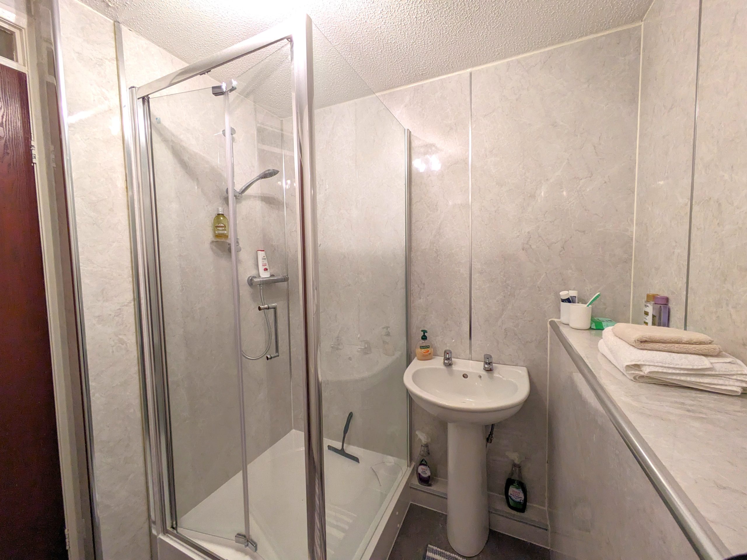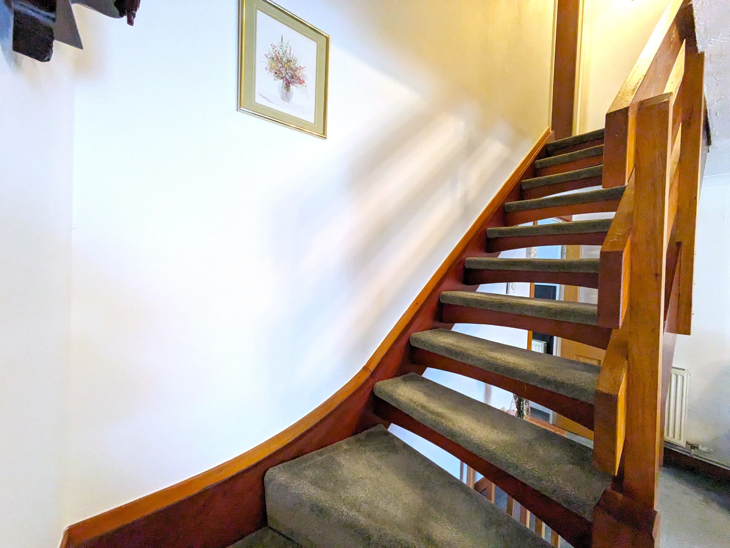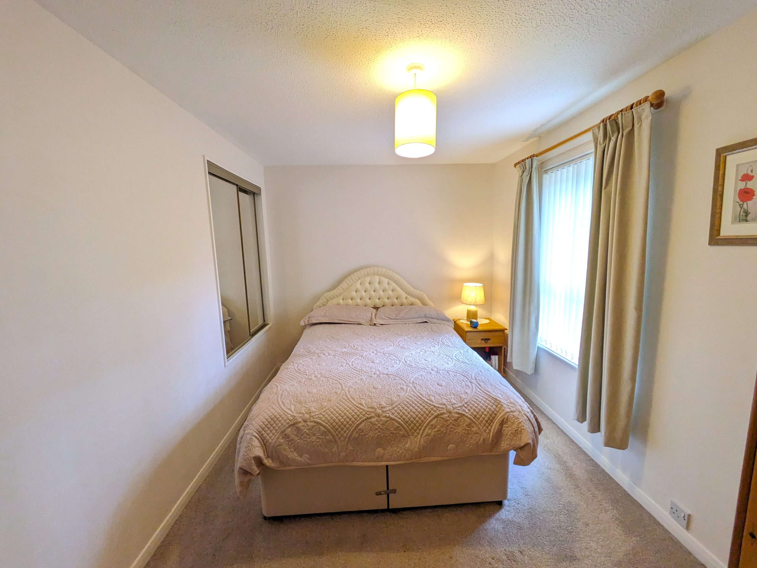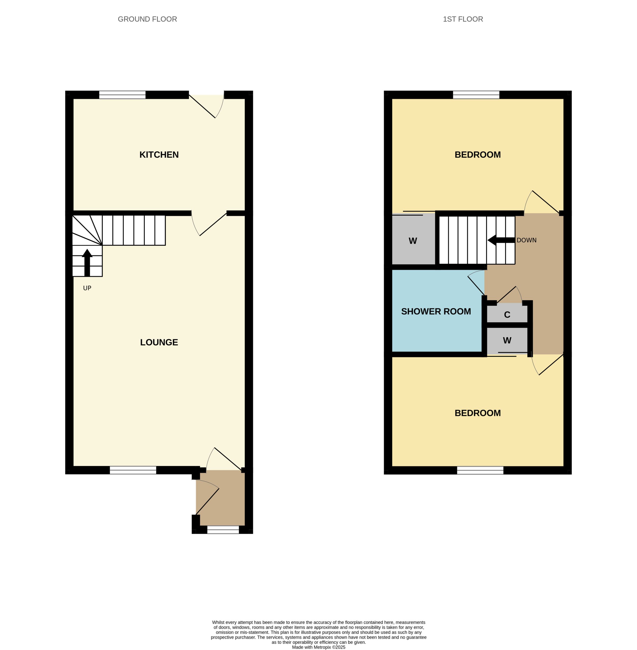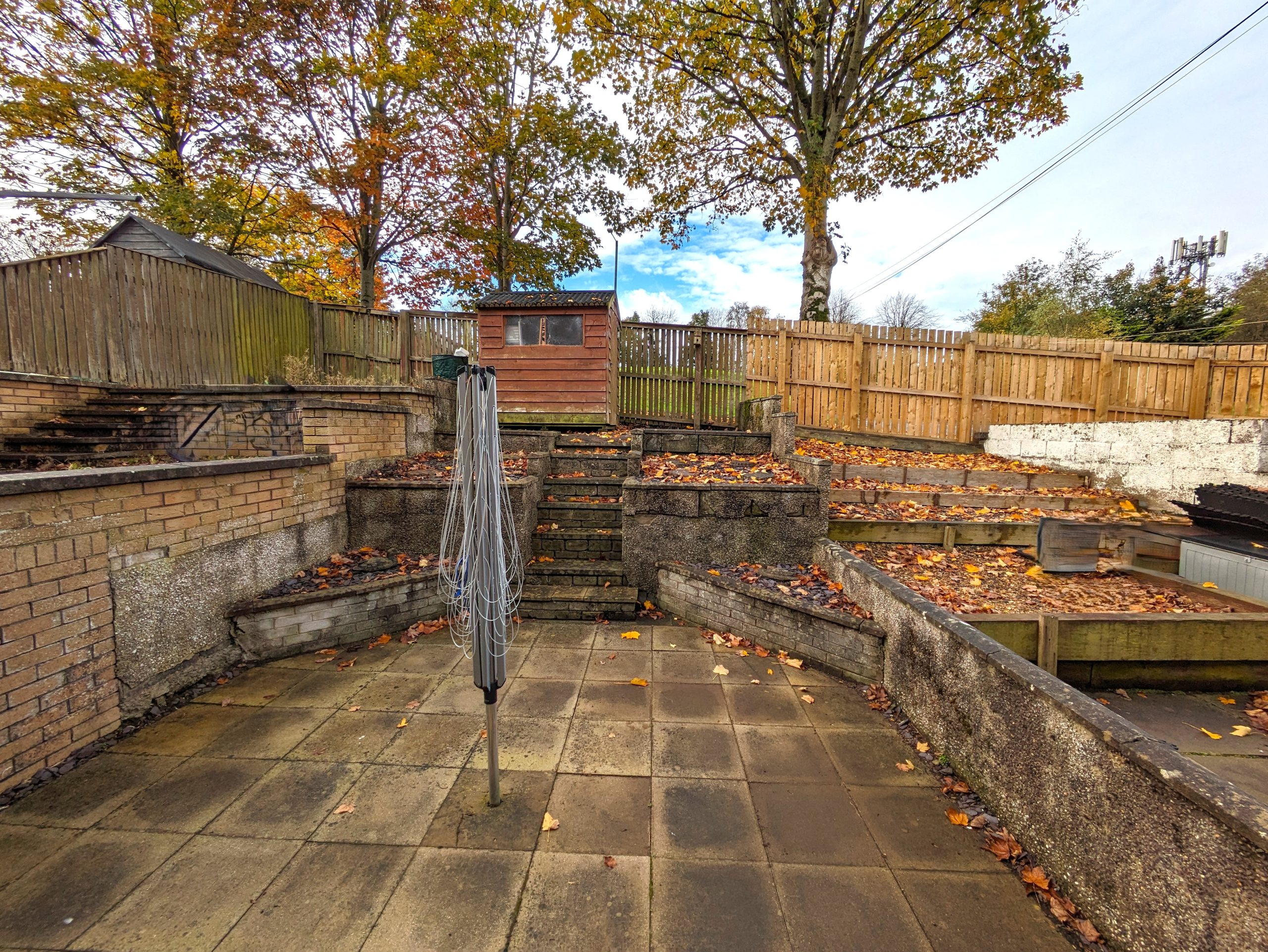 ACCOMMODATION COMPRISES: From the front of the house, steps lead up to front door. Entering the property into the vestibule via a UPVC door with half frosted glass panelling. The entrance vestibule has a small window to front, ceiling light, cupboard housing the electric meter, carpeted flooring which carries on through to the lounge with wooden door featuring glass panelling. The lounge itself is carpeted with large window to front, ceiling light, two radiators and a wooden door with glass panelling leading off into kitchen. The lounge incorporates open riser staircase to upper landing with small understairs storage cupboard and features decorative fireplace with wooden mantle and surround marble effect hearth and electric fire. The kitchen is ample and is fitted with carpeted flooring, a selection of wooden effect wall cupboards, one of which houses the ‘Ideal’ combi boiler, base units and marble effect laminate worktops which incorporates working areas and extends to a fixed wall mounted table. Single drainer sink unit with window to rear overlooking garden, integrated ‘Blomberg’ electric cooker with gas hob with extractor hood, ‘Indesit’ tumble dryer condenser, standalone ‘Beko’ fridge freezer and washing machine which are all included in sale. Wooden effect UPVC door with half glass panel leads from kitchen to back garden. Carpeted stairs with wooden banister leads to upper landing, which is carpeted with ceiling light, hatchway to loft, linen cupboard and leads off to both bedrooms and shower room. Both bedrooms are double in size, carpeted with ceiling lights, radiator and built in mirrored wardrobes. One front facing, one rear. The fitted bathroom comprises of WC, wash hand basin, shower cubicle with mains shower and folding glass doors. Full Respatex surround, tile effect vinyl flooring and ceiling light. The outside of the property has a private garden to the rear, made up of patio/area of slabs. Split level with steps giving access to top tier which has wooden shed. Brick built wall and wooden fence to border. To the front there is a slabbed area with steps leading down to allocated parking bay and a shared area of lawn.
